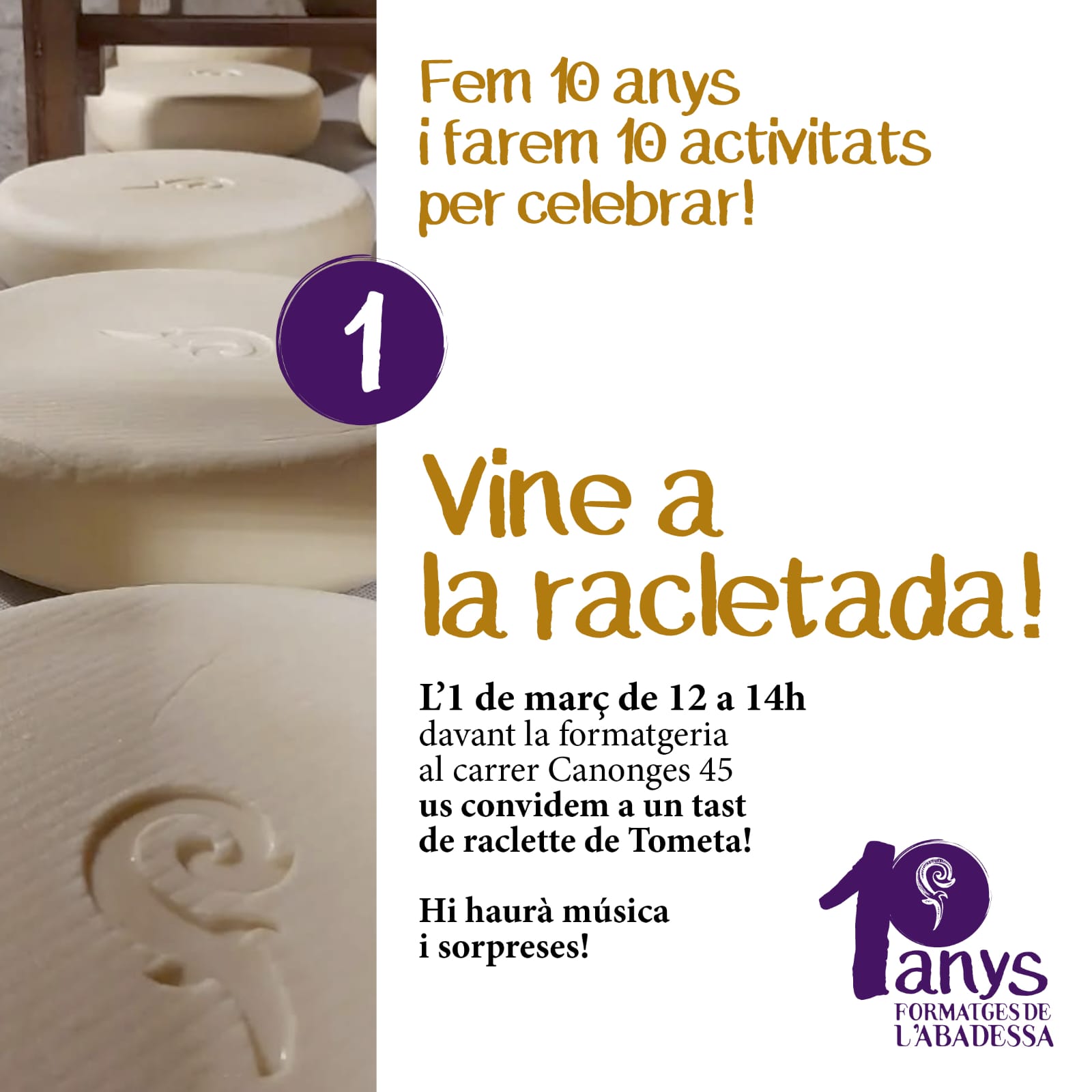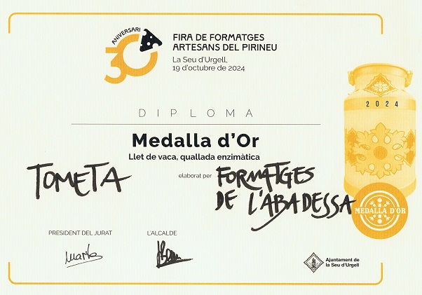 Hi surt: "TOMETA": Formatge tipus “Tomme” de llet crua ecològica de vaca de raça Bruna, madurat 2 mesos mínim, de crosta rentada, textura elàstica. |