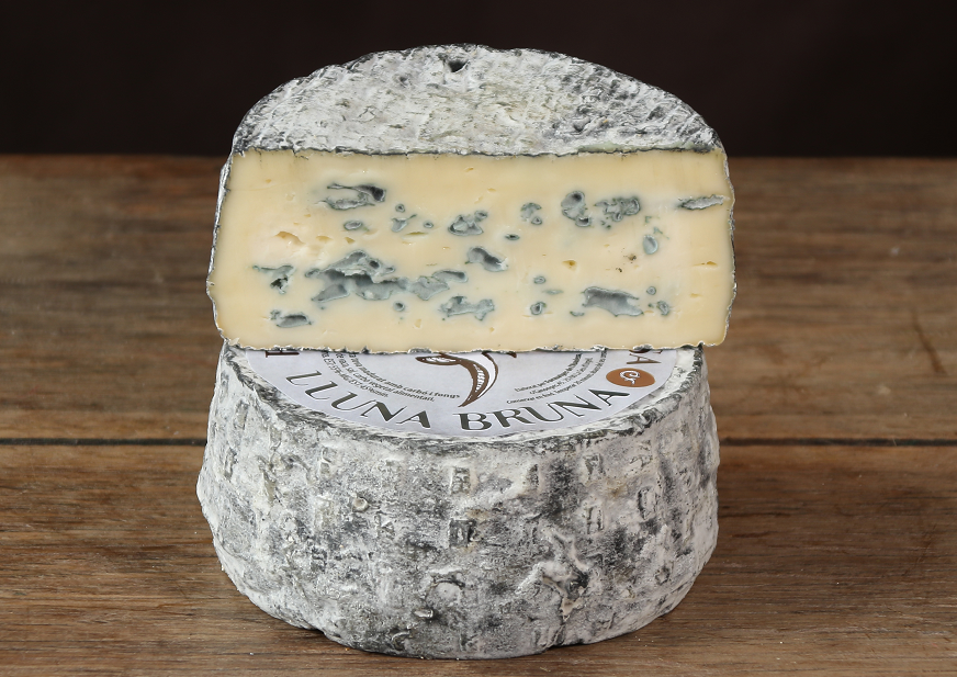 Hi surt: "LLUNA BRUNA": Formatge blau de llet crua ecològica de vaca de raça Bruna i de crosta amb carbó i Penicillium blanc, 2 mesos de maduració. |